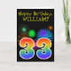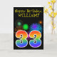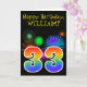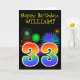 The front of this fun, vibrant birthday greeting card design features a colorful pattern inspired by celebratory fireworks, along with the number "33" featuring a multicolored rainbow inspired gradient pattern, on a black colored background. The front also features a birthday greeting message, including a customized recipient name. The inside features a custom birthday greeting message, or could perhaps be cleared and left blank if a message is to be written by hand instead. A customizable birthday card like this might be a fun way to acknowledge somebody’s thirty third birthday. [~Z0000330]