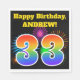This fun, vibrant paper napkin design features a colourful celebratory fireworks inspired pattern, along with the number "33" having a multicolored rainbow like gradient pattern, on a black coloured background. It also features a custom name and event message. Paper napkins like this might be used at a birthday party being held to celebrate somebody’s thirty third birthday. [~Z0000326]