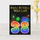The front of this fun, vibrant birthday greeting card design features a colourful celebratory fireworks inspired pattern, along with the number "38" having a multicolored rainbow like gradient pattern, on a black coloured background. The front also features a birthday greeting message, including a customisable recipient name. The inside features a custom birthday greeting message, or could perhaps be cleared and left blank if a message is to be written by hand instead. A customisable birthday card like this might be a fun way to acknowledge somebody’s thirty eighth birthday. [~Z0000330]