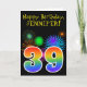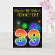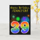 The front of this fun, vibrant birthday greeting card design features a colourful pattern inspired by celebratory fireworks, along with the number "39" having a multicolored rainbow like gradient pattern, on a black coloured background. The front also features a birthday greeting message, including a customised recipient name. The inside features a custom birthday greeting message, or could perhaps be cleared and left blank if a message is to be written by hand instead. A personalised birthday card like this might be a fun way to acknowledge somebody’s thirty ninth birthday. [~Z0000330]