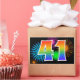 This fun, vibrant sticker design features a colourful celebratory fireworks inspired pattern, along with the number "41" featuring a multicolored rainbow inspired gradient pattern, on a black coloured background. Stickers like this might be used at a party celebrating somebody’s forty first birthday, or perhaps for a couple’s forty first wedding anniversary, or some other 41st event. [~Z0000324]