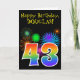 The front of this fun, vibrant birthday greeting card design features a colourful celebratory fireworks inspired pattern, along with the number "43" featuring a multicolored rainbow inspired gradient pattern, on a black coloured background. The front also features a birthday greeting message, including a customisable recipient name. The inside features a customisable birthday greeting message, or could perhaps be cleared and left blank if a message is to be written by hand instead. A customisable birthday card like this might be a fun way to acknowledge somebody’s forty third birthday. [~Z0000330]
