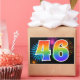 This fun, vibrant sticker design features a colourful pattern inspired by celebratory fireworks, along with the number "46" featuring a multicolored rainbow inspired gradient pattern, on a black coloured background. Stickers like this might be used at a party celebrating somebody’s forty sixth birthday, or perhaps for a couple’s forty sixth wedding anniversary, or some other 46th event. [~Z0000324]