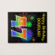 This fun, vibrant puzzle design features a colourful pattern inspired by celebratory fireworks, along with the number "47" featuring a multicolored rainbow inspired gradient pattern, on a black coloured background. It also features a customisable name and event message, such as a birthday greeting. A puzzle like this might be a fun way to send a birthday message to acknowledge somebody’s forty seventh birthday. [~Z0000329]