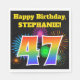 This fun, vibrant paper napkin design features a colourful celebratory fireworks inspired pattern, along with the number "47" having a multicolored rainbow like gradient pattern, on a black coloured background. It also features a customisable name and event message. Paper napkins like this could perhaps be used at a party being held to celebrate somebody’s forty seventh birthday. [~Z0000326]