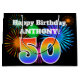 This fun, vibrant gift bag design features a colourful pattern inspired by celebratory fireworks, along with the number "50" featuring a multicolored rainbow inspired gradient pattern, on a black coloured background. It also features a customisable name and event message, such as a birthday greeting. A colourful gift bag like this might be used when wrapping a gift or present that is being given in celebration of somebody’s fiftieth birthday. [~Z0000328]