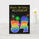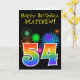 The front of this fun, vibrant birthday greeting card design features a colourful celebratory fireworks inspired pattern, along with the number "54" having a multicolored rainbow like gradient pattern, on a black coloured background. The front also features a birthday greeting message, including a customisable recipient name. The inside features a custom birthday greeting message, or could perhaps be cleared and left blank if a message is to be written by hand instead. A customisable birthday card like this might be a fun way to acknowledge somebody’s fifty fourth birthday. [~Z0000330]