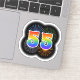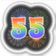 This fun, exciting sticker design features a colourful pattern inspired by bursting celebratory fireworks, along with the number "55" featuring a multicolored rainbow like spectrum or gradient pattern. An exciting sticker like this might be used when celebrating somebody’s fifty fifth birthday, or perhaps a couple’s fifty fifth wedding anniversary, or some other 55th event. [~Z0000362]