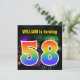 This fun, vibrant birthday party invitation design features a colourful pattern inspired by bursting celebratory fireworks, along with the number "58" featuring a multicolored rainbow inspired spectrum or gradient pattern. The name on the front can be personalised. The back features personalised details about the party. Birthday party invitations like this might be sent to invite guests to a birthday party being held to celebrate somebody’s fifty eighth birthday. [~Z0000337]