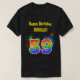This fun, vibrant shirt design features a colourful pattern inspired by bursting celebratory fireworks, along with the number "59" having a multicolored rainbow like spectrum or gradient pattern. It also features a customisable name and event message, such as a "Happy Birthday" birthday greeting. A shirt like this might be worn by the guests at a birthday party being held in celebration of somebody’s fifty ninth birthday. [~Z0000332]