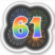 This fun, vibrant sticker design features a colourful pattern inspired by bursting celebratory fireworks, along with the number "61" having a multicolored rainbow inspired spectrum or gradient pattern. An exciting sticker like this might be used when celebrating somebody’s sixty first birthday, or perhaps a couple’s sixty first wedding anniversary, or some other 61st event. [~Z0000362]