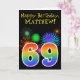 The front of this fun, vibrant birthday greeting card design features a colorful pattern inspired by celebratory fireworks, along with the number "69" having a multicolored rainbow like gradient pattern, on a black colored background. The front also features a birthday greeting message, including a customized recipient name. The inside features a custom birthday greeting message, or could perhaps be cleared and left blank if a message is to be written by hand instead. A customizable birthday card like this might be a fun way to send birthday wishes to somebody who is celebrating their sixty ninth birthday. [~Z0000330]