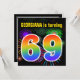 This fun, vibrant birthday party invitation design features a colourful pattern inspired by bursting celebratory fireworks, along with the number "69" having a multicolored rainbow inspired spectrum or gradient pattern. The name on the front can be personalised. The back features custom details about the party. Birthday party invitations like this might be sent to potential attendees for a birthday party being held to celebrate somebody’s sixty ninth birthday. [~Z0000337]
