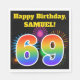 This fun, vibrant paper napkin design features a colourful pattern inspired by celebratory fireworks, along with the number "69" featuring a multicolored rainbow like gradient pattern, on a black coloured background. It also features a customisable name and event message. Paper napkins like this might be used at a party being held to celebrate somebody’s sixty-ninth birthday. [~Z0000326]