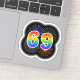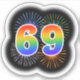 This fun, vibrant sticker design features a colourful pattern inspired by bursting celebratory fireworks, along with the number "69" having a multicolored rainbow like spectrum or gradient pattern. An exciting sticker like this might be used when celebrating somebody’s sixty ninth birthday, or perhaps a couple’s sixty ninth wedding anniversary, or some other 69th event. [~Z0000362]