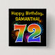 This fun, vibrant button design features a colourful pattern inspired by bursting celebratory fireworks, along with the number "72" featuring a multicolored rainbow like spectrum or gradient pattern. It also features a custom name and event message, such as a "Happy Birthday" birthday greeting. A button like this might be worn by the guests at a birthday party being held in celebration of somebody’s seventy second birthday. [~Z0000334]