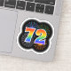This fun, vibrant sticker design features a colourful pattern inspired by bursting celebratory fireworks, along with the number "72" featuring a multicolored rainbow inspired spectrum or gradient pattern. A fun sticker like this might be fun to use when celebrating somebody’s seventy second birthday, or perhaps a couple’s seventy second wedding anniversary, or some other 72nd event. [~Z0000362]