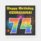 This fun, vibrant paper napkin design features a colourful pattern inspired by celebratory fireworks, along with the number "74" having a multicolored rainbow inspired gradient pattern, on a black coloured background. It also features a customisable name and event message. Paper napkins like this could perhaps be used at a birthday party being held to celebrate somebody’s seventy fourth birthday. [~Z0000326]