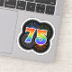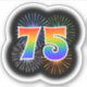 This fun, vibrant sticker design features a colourful bursting celebratory fireworks inspired pattern, along with the number "75" featuring a multicolored rainbow inspired spectrum or gradient pattern. A fun sticker like this might be used when celebrating somebody’s seventy fifth birthday, or perhaps a couple’s seventy fifth wedding anniversary, or some other 75th event. [~Z0000362]