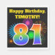 This fun, vibrant paper napkin design features a colourful celebratory fireworks inspired pattern, along with the number "81" having a multicolored rainbow inspired gradient pattern, on a black coloured background. It also features a custom name and event message. Paper napkins like this might be used at a party being held to celebrate somebody’s eighty first birthday. [~Z0000326]