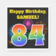 This fun, vibrant paper napkin design features a colourful pattern inspired by celebratory fireworks, along with the number "84" having a multicolored rainbow inspired gradient pattern, on a black coloured background. It also features a custom name and event message. Paper napkins like this might be used at a birthday party being held to celebrate somebody’s eighty fourth birthday. [~Z0000326]