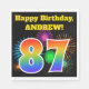 This fun, vibrant paper napkin design features a colourful pattern inspired by celebratory fireworks, along with the number "87" having a multicolored rainbow like gradient pattern, on a black coloured background. It also features a custom name and event message. Paper napkins like this might be used at a birthday party being held to celebrate somebody’s eighty seventh birthday. [~Z0000326]
