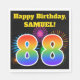 This fun, vibrant paper napkin design features a colourful celebratory fireworks inspired pattern, along with the number "88" featuring a multicolored rainbow inspired gradient pattern, on a black coloured background. It also features a customisable name and event message. Paper napkins like this could perhaps be used at a birthday party being held to celebrate somebody’s eighty eighth birthday. [~Z0000326]