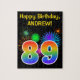 This fun, vibrant puzzle design features a colourful pattern inspired by celebratory fireworks, along with the number "89" having a multicolored rainbow inspired gradient pattern, on a black coloured background. It also features a customisable name and event message, such as a birthday greeting. A puzzle like this might be a fun way to send a greeting message to celebrate somebody’s eighty ninth birthday. [~Z0000329]