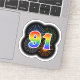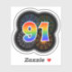 This fun, vibrant sticker design features a colourful pattern inspired by bursting celebratory fireworks, along with the number "91" featuring a multicolored rainbow like spectrum or gradient pattern. An exciting sticker like this might be fun to use when celebrating somebody’s ninety first birthday, or perhaps a couple’s ninety first wedding anniversary, or some other 91st event. [~Z0000362]