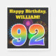 This fun, vibrant paper napkin design features a colourful celebratory fireworks inspired pattern, along with the number "92" having a multicolored rainbow inspired gradient pattern, on a black coloured background. It also features a custom name and event message. Paper napkins like this might be used at a party being held to celebrate somebody’s ninety second birthday. [~Z0000326]