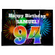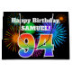 This fun, vibrant gift bag design features a colourful pattern inspired by celebratory fireworks, along with the number "94" having a multicolored rainbow inspired gradient pattern, on a black coloured background. It also features a customisable name and event message, such as a birthday greeting. A gift bag like this might be used to wrap a present or gift being given in celebration of somebody’s ninety fourth birthday. [~Z0000328]