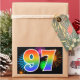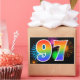This fun, vibrant sticker design features a colourful celebratory fireworks inspired pattern, along with the number "97" having a multicolored rainbow like gradient pattern, on a black coloured background. Stickers like this might be given as a small gift while celebrating somebody’s ninety seventh birthday, or perhaps for a couple’s ninety seventh wedding anniversary, or some other 97th event. [~Z0000324]