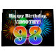 This fun, vibrant gift bag design features a colourful pattern inspired by celebratory fireworks, along with the number "98" having a multicolored rainbow inspired gradient pattern, on a black coloured background. It also features a personalised name and event message, such as a birthday greeting. A fun gift bag like this could be used when wrapping a present or gift being given in celebration of somebody’s ninety eighth birthday. [~Z0000328]