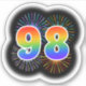 This fun, vibrant sticker design features a colourful pattern inspired by bursting celebratory fireworks, along with the number "98" having a multicolored rainbow like spectrum or gradient pattern. A fun sticker like this might perhaps be used when celebrating somebody’s ninety eighth birthday, or perhaps a couple’s ninety eighth wedding anniversary, or some other 98th event. [~Z0000362]