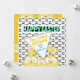 With five cartoon, crazy eyed chickens, on a black and white chicken foot print background in front and another five crazy chickens peeking-in, on a yellow background on the back, this one is just so much fun!