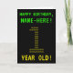 The front of this nerdy, personalised birthday card design features the messages "HAPPY BIRTHDAY" and "1 YEAR OLD!", along with a personalised recipient name. The messages on the front have a look inspired by pixelated retro video games. The number "1" on the front consists of smaller sized "1" digits, giving an ASCII art inspired look. The inside features an editable birthday greeting message. A geeky style, customisable birthday greeting card like this might be given to somebody who is celebrating their 1st birthday. [~Z0000366]