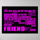 'The greatest most awesome excellent fantastic amazing magnificent super fabulous terrific superb brilliant Friend in the world ....ever! Plus, eye-catching posters, prints & canvas prints, stylish postcards, note cards & greeting cards. And, fashionable binders, notepads, mousepads, stickers, badges & magnets, modern cases for iphones, ipads & ipods, blackberries and more!