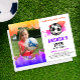 Join us for a vibrant soccer-themed birthday bash! Celebrate your girl amidst colourful soccer balls and pink gradient paint splatters against a white backdrop, and a joyful photo of the birthday girl. It has a bright purple reverse side. This playful invitation promises joy for kids, teens, and adults alike. Customise the details and make it your own, from the text to the atmosphere. With bold sport fonts in striking white and bright green, let's kick off a memorable day and immerse yourself in the excitement of soccer to create unforgettable memories together!