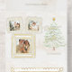 Fun and whimsical holiday greeting featuring three gold foil line drawn doodle square photo frames, watercolor Christmas tree with custom gold foil Peace on Earth calligraphy graphic on a watercolor background. The panels feature additional text fields and a bonus tearaway photo template.