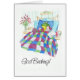 A Get Well card with the greeting in Danish, with a green frog, lying in bed with a hot water bottle and medicine, grapes and flowers all around him, from a handpainted whimsical illustration by Judy Adamson. You can add your own inside message if you wish.