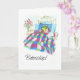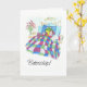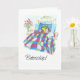 A Get Well card with the greeting in Dutch, with a green frog, lying in bed with a hot water bottle and medicine, grapes and flowers all around him, from a handpainted whimsical illustration by Judy Adamson. You can add your own inside message if you wish.