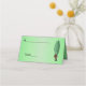 This folded standing place card for your parties, events, and weddings is a fading mix of medium green to lighter green in centre with a fun man with a big green pickle for a head with a surprised looking face wearing a brown suit. Customise the name and table number area and text on the back with the templates.