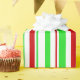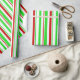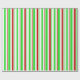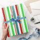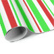 This wrapping paper design features Christmas themed stripes coloured red, white, and green. Wrapping paper like this might be used when wrapping presents or gifts being given in celebration of a birthday, a wedding, an anniversary, or some other event.
