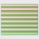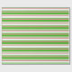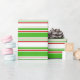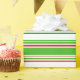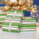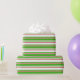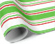 This wrapping paper design features a Christmas and holidays themed green, white, and red coloured striped pattern. Wrapping paper like this might be used when wrapping gifts or presents being given to celebrate a birthday, a wedding, an anniversary, or some other event.