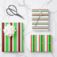 These wrapping paper sheets designs feature Christmas themed patterns of stripes having colours like green, white, and red. Festive wrapping paper sheets like these might be used when wrapping presents being given to celebrate Christmas.