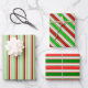 These fun designs feature Christmas inspired striped patterns having colours like red, white, and green. Wrapping paper sheets like these might be used when wrapping presents or gifts being given to celebrate Christmas.