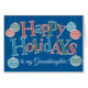 A fun, text-based Happy Holidays card for a Granddaughter, with Ornaments and Lettering, filled with red, blue and green chevrons and polka dots, outline in white on a bright blue background. There is also a custom front card with this design in case you can't find a card for the specific recipient you're looking for.
