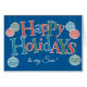 A fun, text-based Happy Holidays card for a Son, with Ornaments and Lettering, filled with red, blue and green chevrons and polka dots, outline in white on a bright blue background. There is also a custom front card with this design in case you can't find a card for the specific recipient you're looking for.