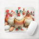 Hens wearing eyeglasses and pearl necklaces with eggs