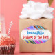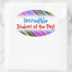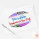 This fun, inspirational sticker design features the message "Incredible Student of the Day!". A sticker like this could perhaps be used to recognise students who have done a good job. [~Z0000317]